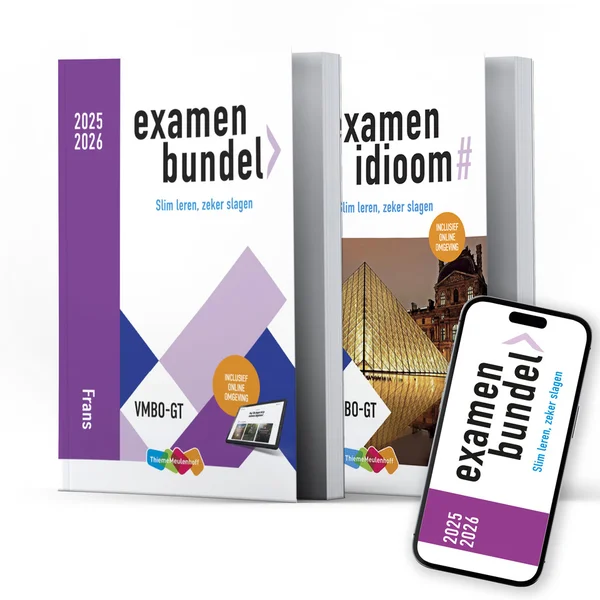 Met het Voordeelpakket vmbo-gt/mavo Frans leer je wat je moet leren en oefen je gericht met examenopgaven en -teksten met Examenbundel en Examenidioom. En je bespaart maar liefst 20%. Voordeelpakketten lopen niet mee in de stapelkorting. Maak een vliegende start als je in 3 vmbo zit of ga ervoor in je examenjaar. Je hebt namelijk twee jaar toegang tot de online materialen. Voeg Zeker Slagen! toe met tips over plannen, leren en motivatie. Examenbundel is al ruim 45 jaar dé perfecte voorbereiding op je eindexamen.